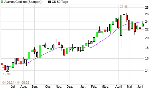 Mit dem Rücksetzer auf 23,63 EUR hat die Alamos Gold-Aktie am 03.06.2025 die 50-Tage-Linie nach unten gekreuzt.