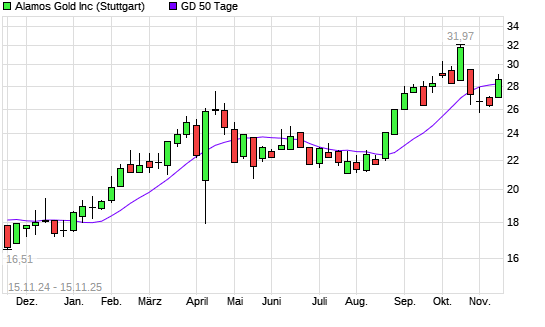 Mit dem Rücksetzer auf 28,14 EUR hat die Alamos Gold-Aktie am 14.11.2025 die 50-Tage-Linie nach unten gekreuzt.