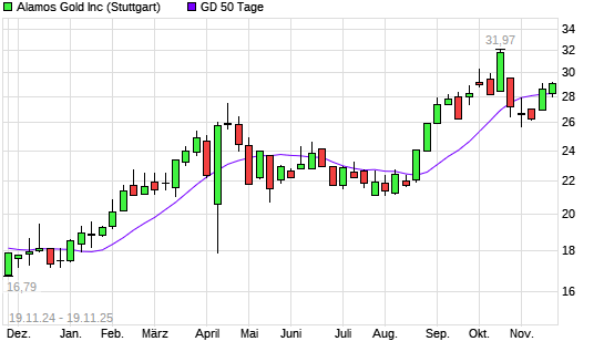 Mit dem Rücksetzer auf 28,06 EUR hat die Alamos Gold-Aktie am 18.11.2025 die 50-Tage-Linie nach unten gekreuzt.