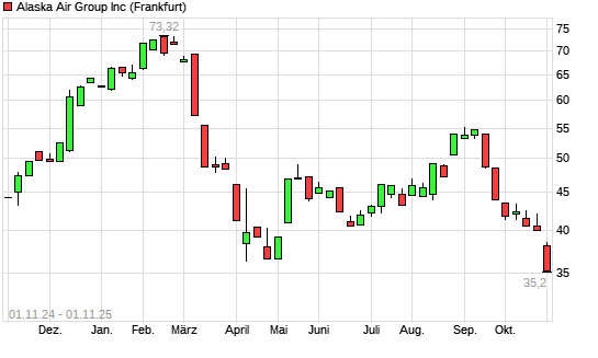 Mit dem Rücksetzer auf 35,10 EUR hat die Alaska Air Group-Aktie (ISIN US0116591092) am 31.10.2025 ein neues 12-Monats-Tief erreicht und damit den Kurs vom 30.10.2025 eingestellt.