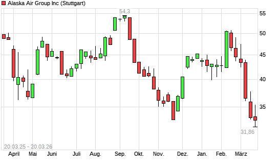Mit dem Rücksetzer auf 32,90 EUR hat die Alaska Air Group-Aktie (ISIN US0116591092) am 19.03.2026 ein neues 12-Monats-Tief erreicht und damit den Kurs vom 21.11.2025 eingestellt.
