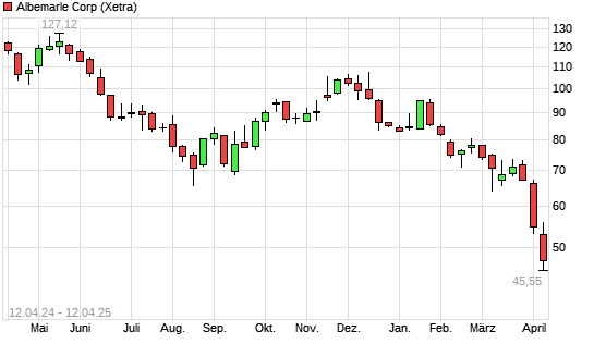 Mit dem Rücksetzer auf 47,39 EUR hat die Albemarle-Aktie (ISIN US0126531013) am 11.04.2025 ein neues 5-Jahres-Tief erreicht und damit den Kurs vom 08.04.2025 eingestellt.