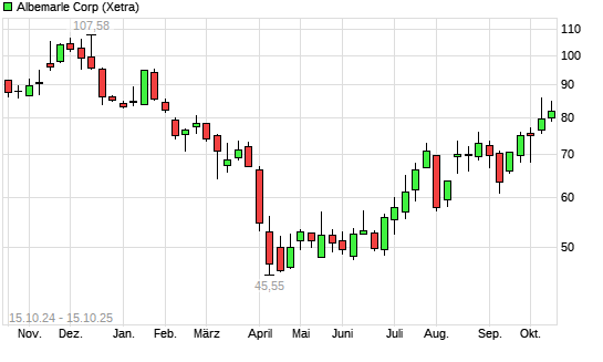 Mit dem Anstieg auf 84,01 EUR hat die Albemarle-Aktie (ISIN US0126531013) am 14.10.2025 ein neues 6-Monats-Hoch erreicht und damit den Kurs vom 13.10.2025 eingestellt.