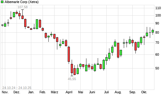 Mit dem Anstieg auf 84,33 EUR hat die Albemarle-Aktie (ISIN US0126531013) am 23.10.2025 ein neues 6-Monats-Hoch erreicht und damit den Kurs vom 15.10.2025 eingestellt.