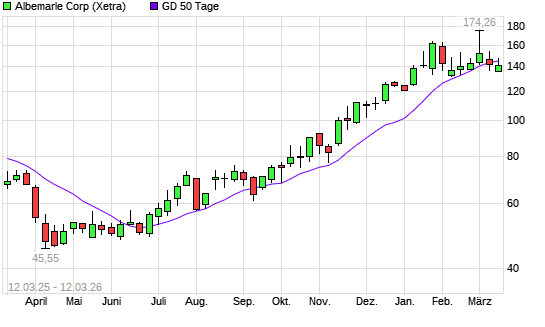 Mit dem Rücksetzer auf 144,54 EUR hat die Albemarle-Aktie am 11.03.2026 die 50-Tage-Linie nach unten gekreuzt.