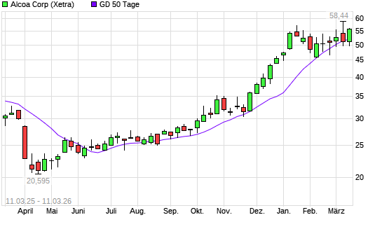 Mit dem Anstieg auf 53,05 EUR hat die Alcoa Upstream-Aktie am 10.03.2026 die 50-Tage-Linie nach oben gekreuzt.