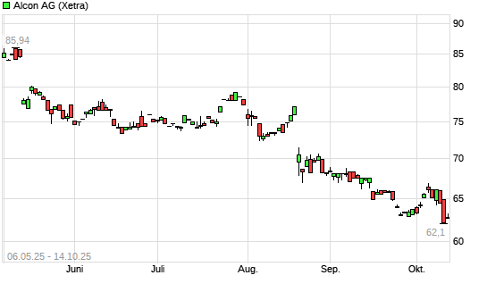 Mit dem Rücksetzer auf 62,68 EUR hat die Alcon-Aktie (ISIN CH0432492467) am 13.10.2025 ein neues 12-Monats-Tief erreicht und damit den Kurs vom 29.09.2025 eingestellt.
