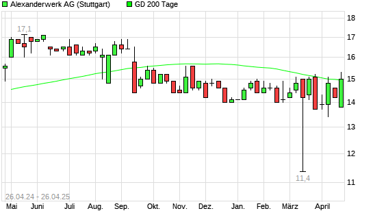 Mit dem Rücksetzer auf 14,50 EUR hat die Alexanderwerk-Aktie am 25.04.2025 die 200-Tage-Linie nach unten gekreuzt.