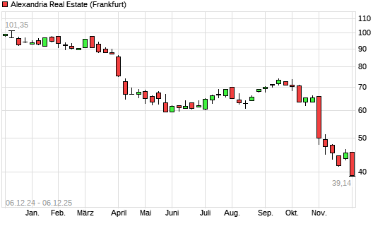 Mit dem Rücksetzer auf 39,14 EUR hat die Alexandria Real Estate-Aktie (ISIN US0152711091) am 05.12.2025 ein neues 10-Jahres-Tief erreicht und damit den Kurs vom 04.12.2025 eingestellt.