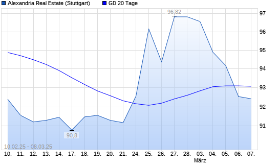 Mit dem Rücksetzer auf 90,76 EUR hat die Alexandria Real Estate-Aktie am 07.03.2025 die 20-Tage-Linie nach unten gekreuzt.
