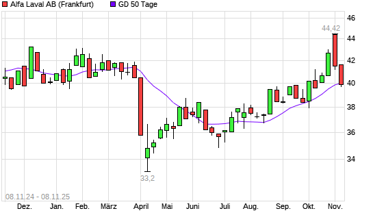 Mit dem Rücksetzer auf 39,93 EUR hat die Alfa Laval-Aktie am 07.11.2025 die 50-Tage-Linie nach unten gekreuzt.