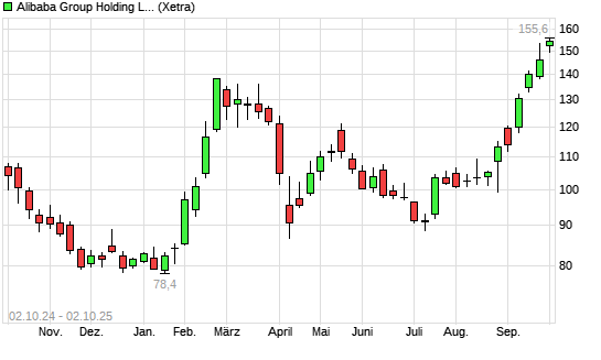 Mit dem Anstieg auf 156,00 EUR hat die Alibaba-Aktie (ISIN US01609W1027) am 01.10.2025 ein neues 3-Jahres-Hoch erreicht und damit den Kurs vom 29.09.2025 eingestellt.