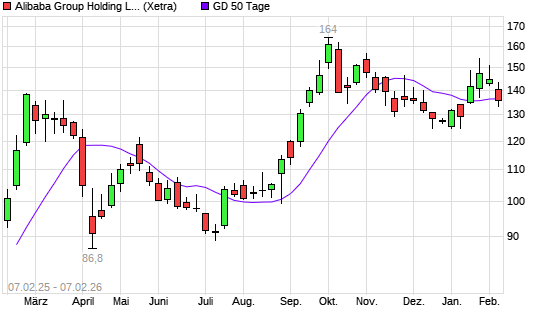 Mit dem Anstieg auf 137,40 EUR hat die Alibaba-Aktie am 06.02.2026 die 50-Tage-Linie nach oben gekreuzt.
