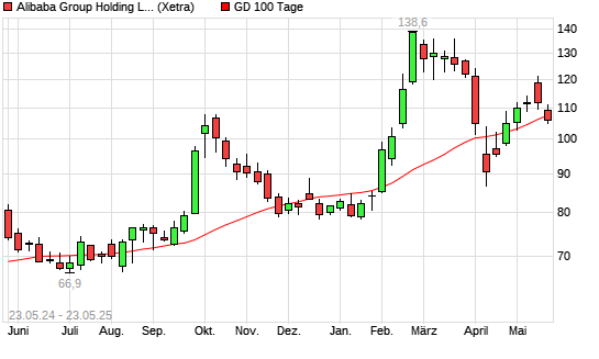 Mit dem Rücksetzer auf 107,60 EUR hat die Alibaba-Aktie am 22.05.2025 die 100-Tage-Linie nach unten gekreuzt.