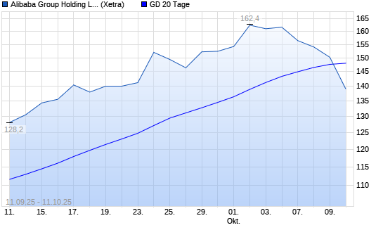 Mit dem Rücksetzer auf 136,60 EUR hat die Alibaba-Aktie am 10.10.2025 die 20-Tage-Linie nach unten gekreuzt.