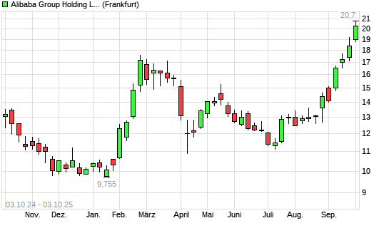 Mit dem Anstieg auf 20,26 EUR hat die Alibaba Group Holding-Aktie (ISIN KYG017191142) am 02.10.2025 ein neues 3-Jahres-Hoch erreicht und damit den Kurs vom 01.10.2025 eingestellt.