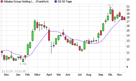 Mit dem Anstieg auf 18,15 EUR hat die Alibaba Group Holding-Aktie am 10.11.2025 die 50-Tage-Linie nach oben gekreuzt.