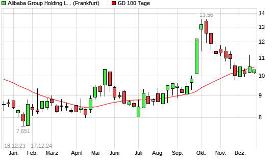 Mit dem Rücksetzer auf 10,25 EUR hat die Alibaba Group Holding-Aktie am 16.12.2024 die 100-Tage-Linie nach unten gekreuzt.
