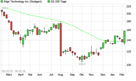 Mit dem Anstieg auf 149,35 EUR hat die Align Technology-Aktie am 05.02.2026 die 200-Tage-Linie nach oben gekreuzt.