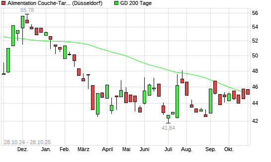 Mit dem Anstieg auf 45,92 EUR hat die Alimentation Couche-Tard-Aktie am 27.10.2025 die 200-Tage-Linie nach oben gekreuzt.