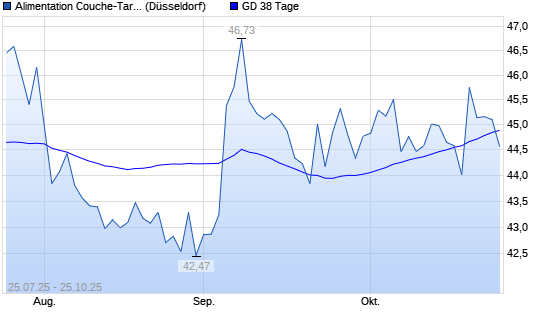 Mit dem Rücksetzer auf 44,61 EUR hat die Alimentation Couche-Tard-Aktie am 24.10.2025 die 38-Tage-Linie nach unten gekreuzt.
