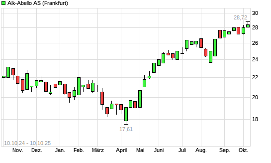 Mit dem Anstieg auf 28,72 EUR hat die Alk Abello-Aktie (ISIN DK0061802139) am 09.10.2025 ein neues All-Time-High erreicht und damit den Kurs vom 08.10.2025 eingestellt.