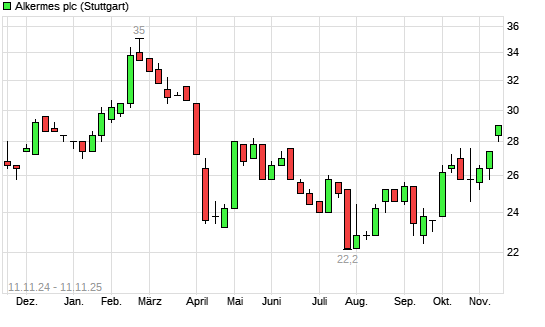 Mit dem Anstieg auf 28,00 EUR hat die Alkermes-Aktie (ISIN IE00B56GVS15) am 10.11.2025 ein neues 6-Monats-Hoch erreicht und damit den Kurs vom 16.05.2025 eingestellt.