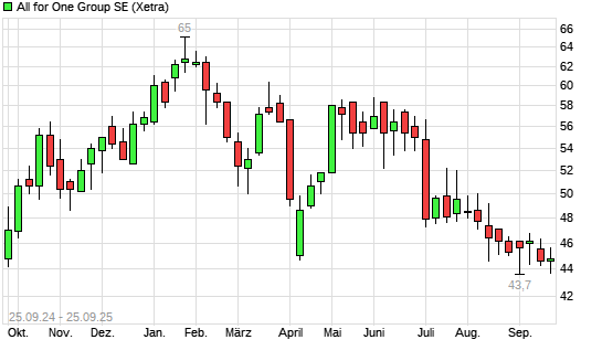 Mit dem Rücksetzer auf 43,50 EUR hat die All for One Group-Aktie (ISIN DE0005110001) am 24.09.2025 ein neues 12-Monats-Tief erreicht und damit den Kurs vom 13.08.2025 eingestellt.