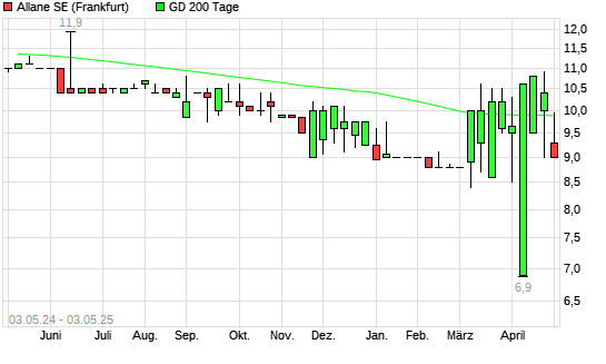 Mit dem Rücksetzer auf 9,00 EUR hat die Allane-Aktie am 02.05.2025 die 200-Tage-Linie nach unten gekreuzt.