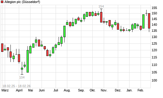 Mit dem Anstieg auf 156,00 EUR hat die Allegion-Aktie (ISIN IE00BFRT3W74) am 17.02.2026 ein neues All-Time-High erreicht und damit den Kurs vom 22.10.2025 eingestellt.
