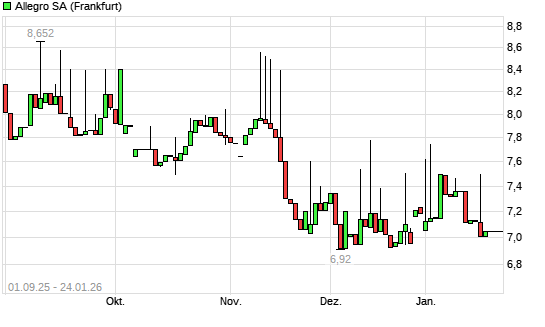 Mit dem Rücksetzer auf 6,87 EUR hat die Allegro-Aktie (ISIN LU2237380790) am 23.01.2026 ein neues 6-Monats-Tief erreicht und damit den Kurs vom 21.11.2025 eingestellt.