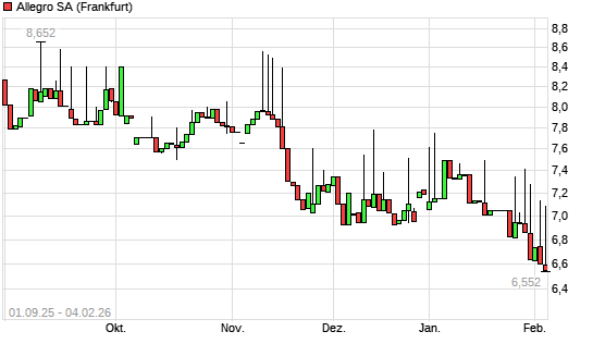 Mit dem Rücksetzer auf 6,59 EUR hat die Allegro-Aktie (ISIN LU2237380790) am 03.02.2026 ein neues 6-Monats-Tief erreicht und damit den Kurs vom 30.01.2026 eingestellt.