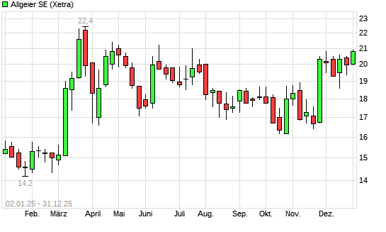 Mit dem Anstieg auf 20,80 EUR hat die Allgeier-Aktie (ISIN DE000A2GS633) am 30.12.2025 ein neues 6-Monats-Hoch erreicht und damit den Kurs vom 16.07.2025 eingestellt.