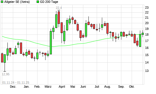 Mit dem Anstieg auf 18,40 EUR hat die Allgeier-Aktie am 31.10.2025 die 200-Tage-Linie nach oben gekreuzt.