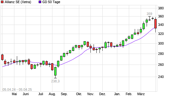 Mit dem Rücksetzer auf 324,80 EUR hat die Allianz-Aktie am 04.04.2025 die 50-Tage-Linie nach unten gekreuzt.