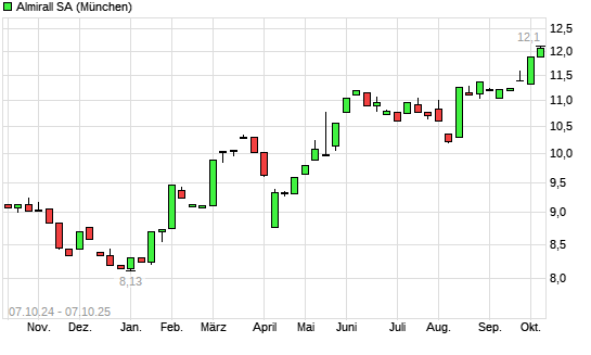 Mit dem Anstieg auf 11,88 EUR hat die Almirall-Aktie (ISIN ES0157097017) am 06.10.2025 ein neues 3-Jahres-Hoch erreicht und damit den Kurs vom 03.10.2025 eingestellt.
