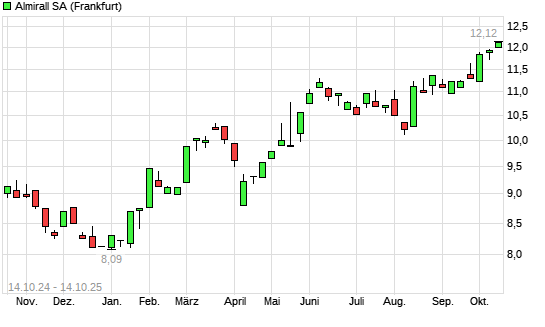 Mit dem Anstieg auf 12,00 EUR hat die Almirall-Aktie (ISIN ES0157097017) am 13.10.2025 ein neues 3-Jahres-Hoch erreicht und damit den Kurs vom 07.10.2025 eingestellt.