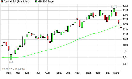 Mit dem Rücksetzer auf 11,86 EUR hat die Almirall-Aktie am 11.03.2026 die 200-Tage-Linie nach unten gekreuzt.