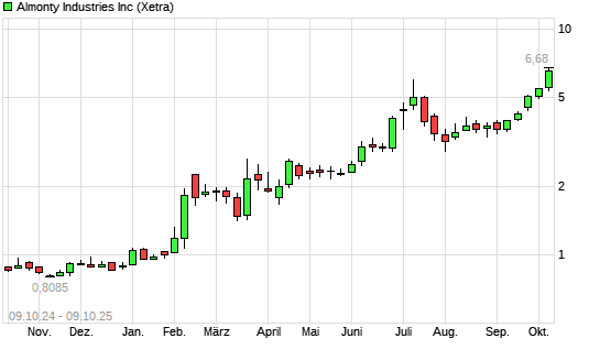 Mit dem Anstieg auf 6,55 EUR hat die Almonty Industries-Aktie (ISIN CA0203987072) am 08.10.2025 ein neues All-Time-High erreicht und damit den Kurs vom 07.10.2025 eingestellt.