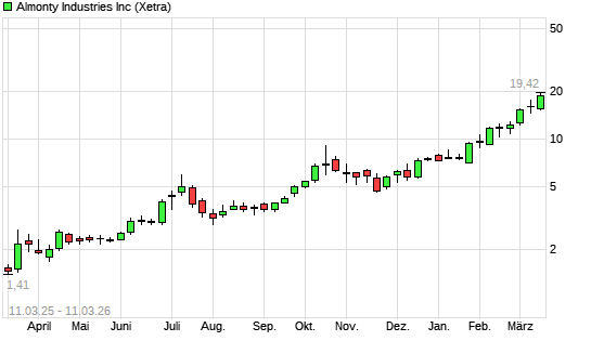 Mit dem Anstieg auf 18,36 EUR hat die Almonty Industries-Aktie (ISIN CA0203987072) am 10.03.2026 ein neues All-Time-High erreicht und damit den Kurs vom 02.03.2026 eingestellt.
