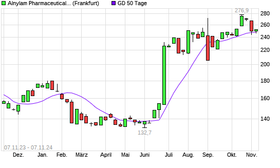 Mit dem Anstieg auf 250,00 EUR hat die Alnylam Pharmaceuticals-Aktie am 06.11.2024 die 50-Tage-Linie nach oben gekreuzt.