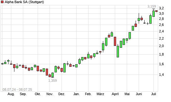 Mit dem Anstieg auf 3,16 EUR hat die Alpha Bank-Aktie (ISIN GRS830003000) am 07.07.2025 ein neues 5-Jahres-Hoch erreicht und damit den Kurs vom 04.07.2025 eingestellt.