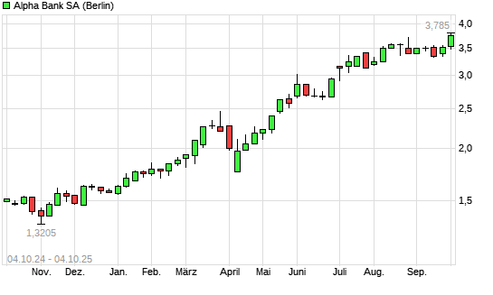 Mit dem Anstieg auf 3,75 EUR hat die Alpha Bank-Aktie (ISIN GRS830003000) am 03.10.2025 ein neues 5-Jahres-Hoch erreicht und damit den Kurs vom 25.08.2025 eingestellt.