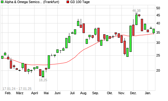 Mit dem Anstieg auf 35,36 EUR hat die Alpha & Omega Semiconductor-Aktie am 16.01.2025 die 100-Tage-Linie nach oben gekreuzt.