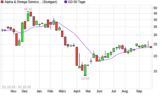 Mit dem Rücksetzer auf 23,40 EUR hat die Alpha & Omega Semiconductor-Aktie am 30.09.2025 die 50-Tage-Linie nach unten gekreuzt.
