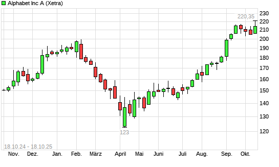 Mit dem Anstieg auf 217,05 EUR hat die Alphabet A (ex GOOGLE)-Aktie (ISIN US02079K3059) am 17.10.2025 ein neues All-Time-High erreicht und damit den Kurs vom 19.09.2025 eingestellt.