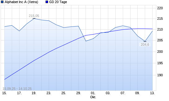 Mit dem Anstieg auf 211,00 EUR hat die Alphabet A (ex GOOGLE)-Aktie am 13.10.2025 die 20-Tage-Linie nach oben gekreuzt.