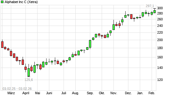 Mit dem Anstieg auf 291,45 EUR hat die Alphabet C-Aktie (ISIN US02079K1079) am 02.02.2026 ein neues All-Time-High erreicht und damit den Kurs vom 13.01.2026 eingestellt.