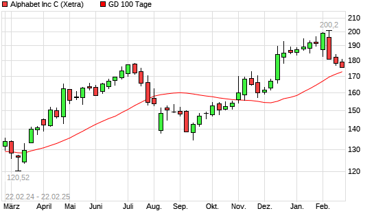 Mit dem Rücksetzer auf 173,80 EUR hat die Alphabet C-Aktie am 21.02.2025 die 100-Tage-Linie nach unten gekreuzt.