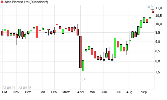Mit dem Anstieg auf 10,90 EUR hat die Alps Electric-Aktie (ISIN JP3126400005) am 22.09.2025 ein neues 3-Jahres-Hoch erreicht und damit den Kurs vom 05.09.2025 eingestellt.